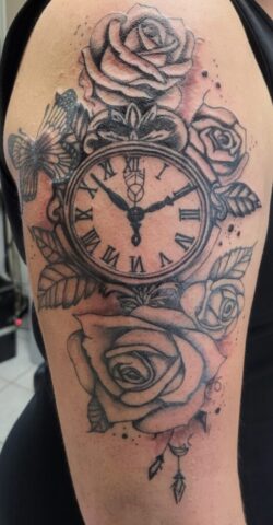Zwart-wit tattoo van een zakhorloge met rozen en een vlinder op de bovenarm.