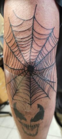 Zwart-wit spinnenweb tattoo op elleboog met een duister gezicht eronder.