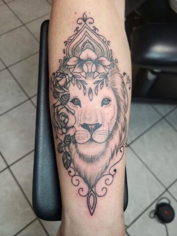 Fineline leeuwenkop met rozen en sierlijke omlijsting.