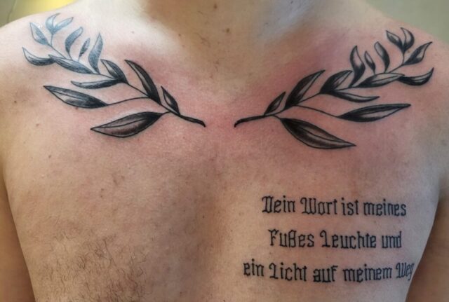 Twee olijftakken en Duitse bijbeltekst op de borst.