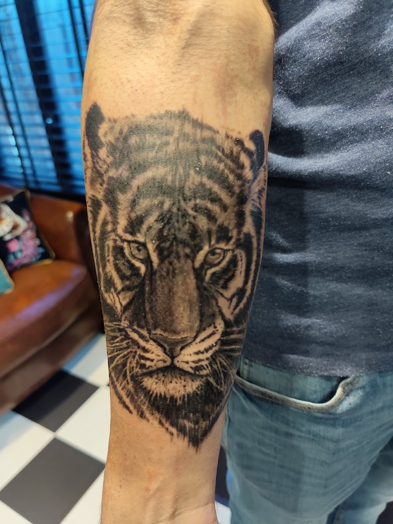 Realistische zwart-wit tijgerkop tattoo op onderarm.