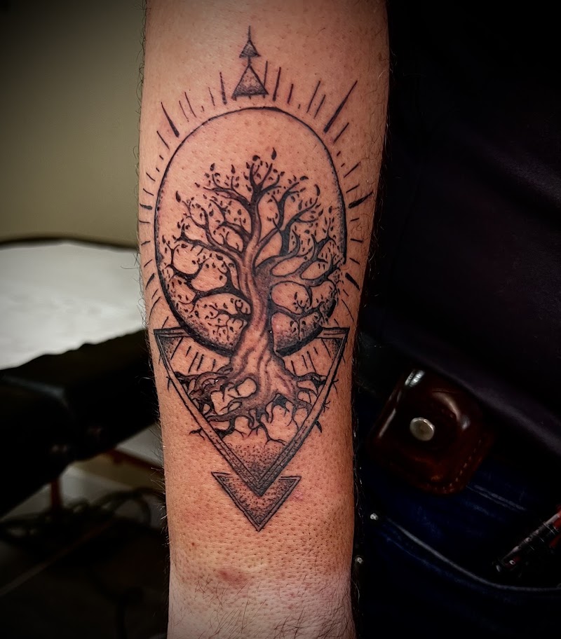 Geometrische levensboom tattoo met cirkel en driehoeken op onderarm.