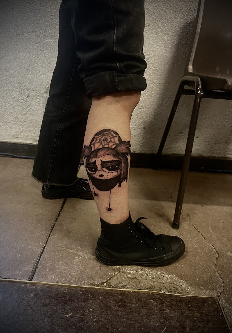 Illustratieve tattoo van een meisje met spinnenweb en spinnen op het onderbeen.