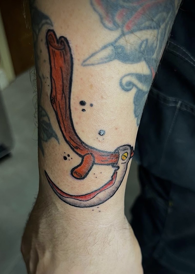 Neo-traditional zeis met houten steel en oog op de onderarm.