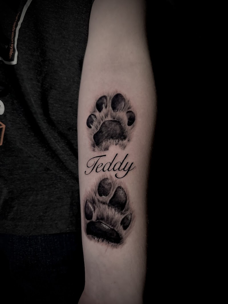 Realistische hondenpootafdrukken met de naam 'Teddy' op de onderarm.