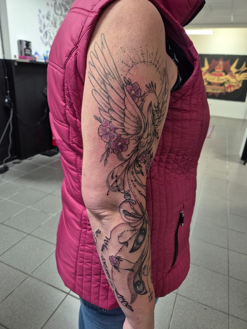 Sierlijke fenix met paarse bloemen en tekst op de arm.