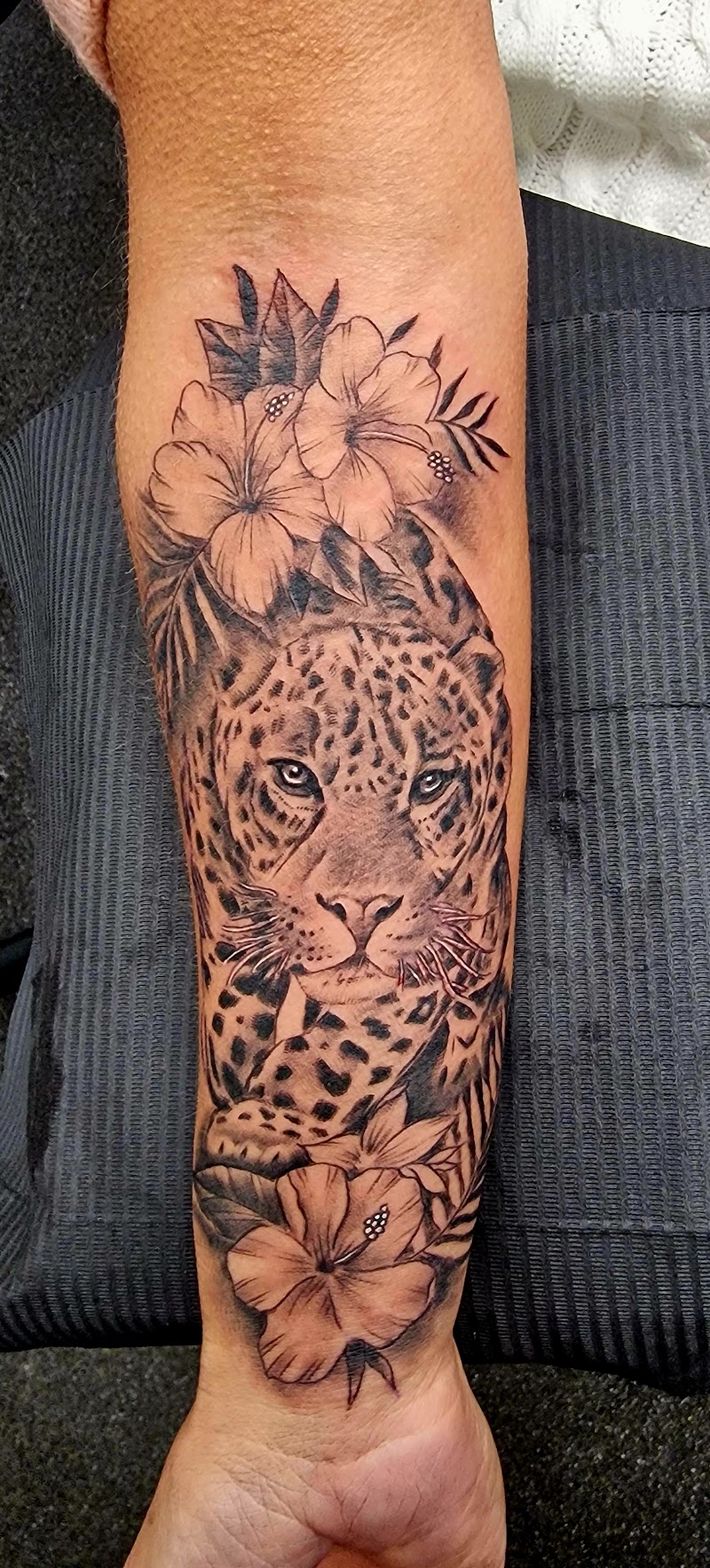 Realistische luipaard met hibiscus bloemen op onderarm.