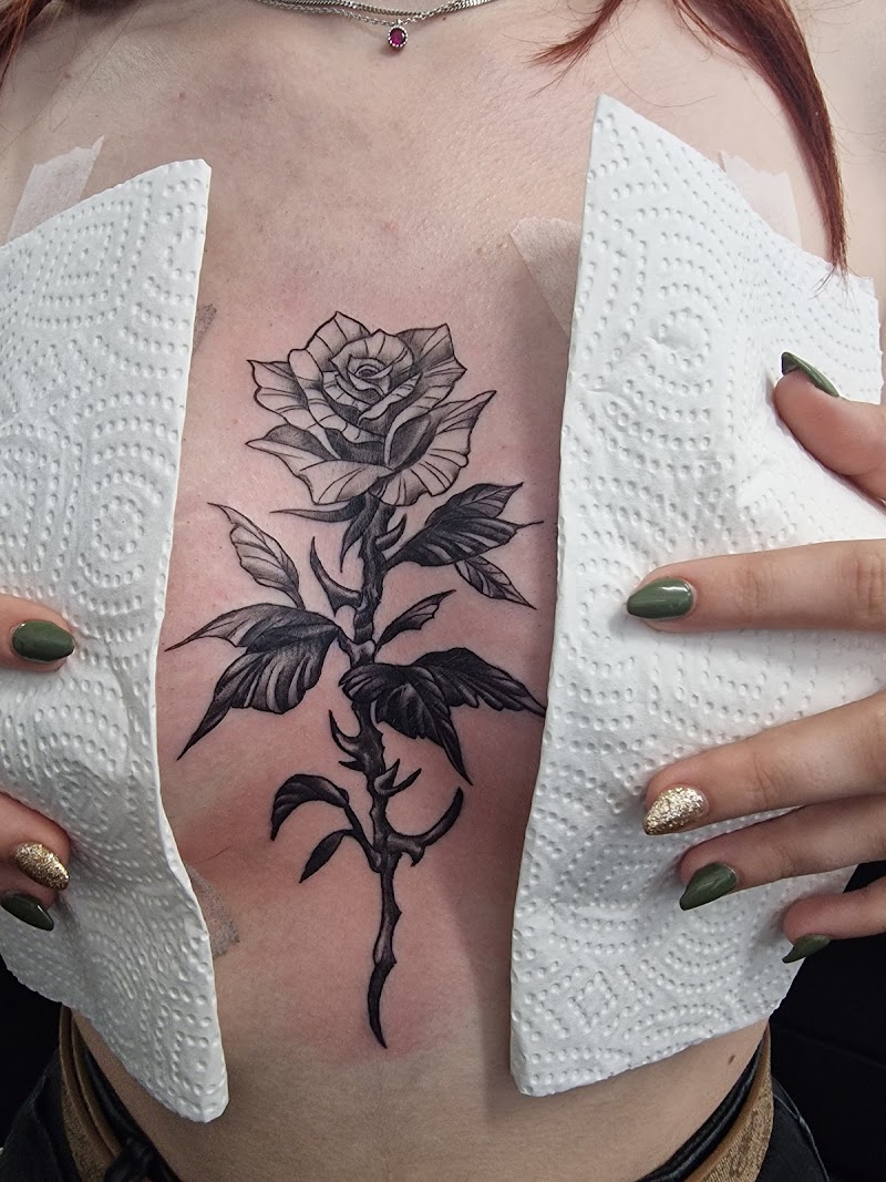 Zwart-wit roos met doornen op de borst.