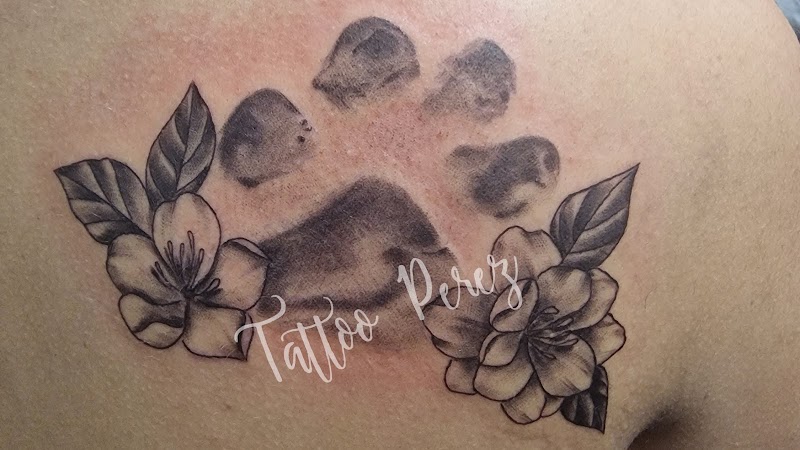 Hondenpootafdruk met bloemen en bladeren op schouderblad.