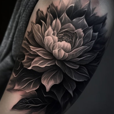 Realistische zwart-grijze pioenroos op bovenarm.