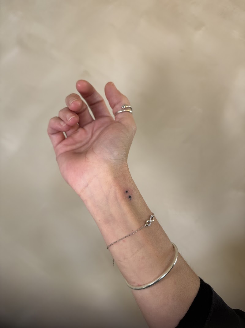 Kleine minimalistische puntkomma tattoo op de pols.