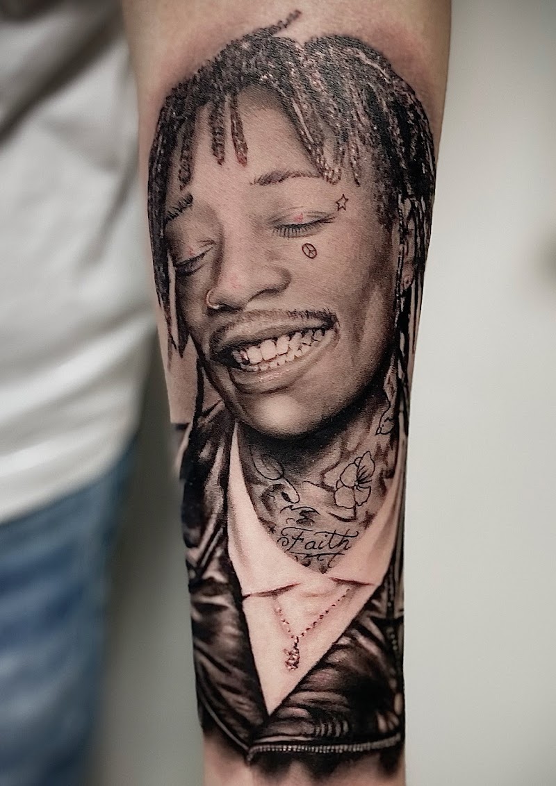 Realistisch zwart-wit portret van rapper Wiz Khalifa op de onderarm.