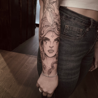 Gedetailleerde Medusa tattoo met slangenhaar op de onderarm.