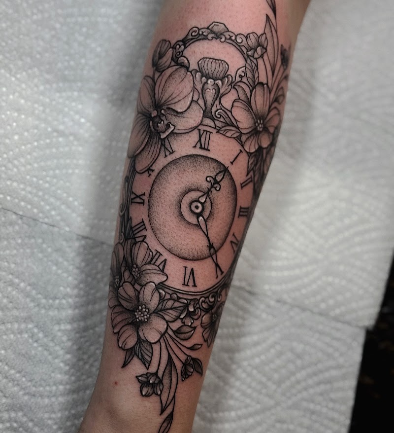 Zwart-wit zakhorloge met bloemen en Romeinse cijfers op onderarm.