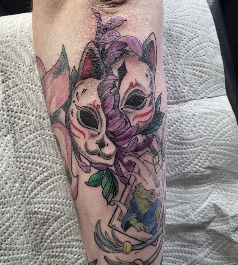 Neo-traditionele tattoo van twee kitsune maskers, een paarse bloem en een kikker.