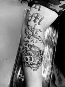 Zwart-wit tattoo van een varken met pet en sigaar, en gotische letters erboven.