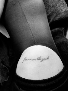 Fineline tekst 'focus on the good' op onderrug.
