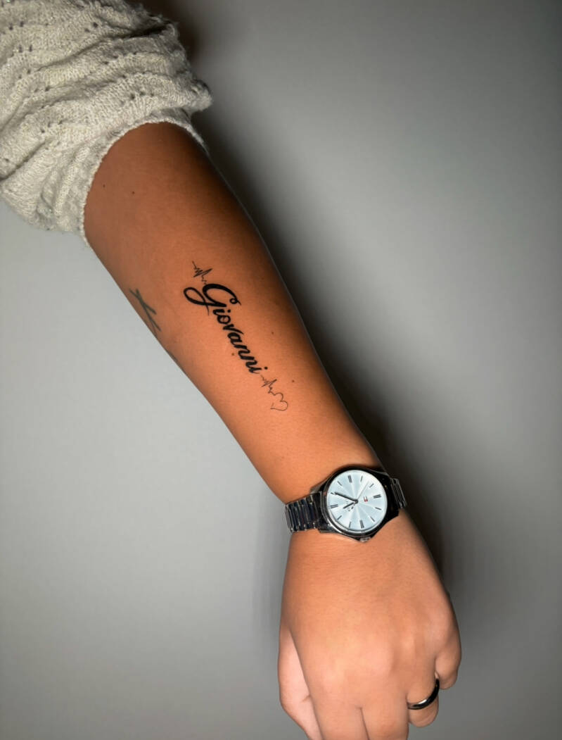 "Giovanni" naam met hartslag en hartje op onderarm.