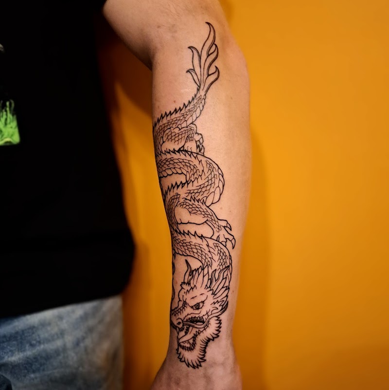 Grote Japanse draak lijnwerk tattoo op onderarm.