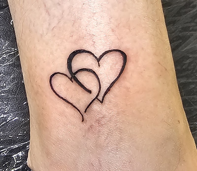 Twee in elkaar verstrengelde harten, minimalistisch lijnwerk op de enkel.