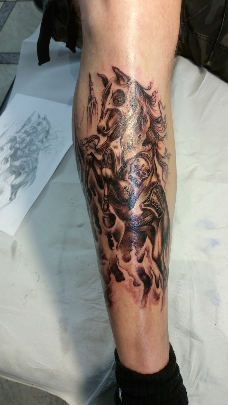 Zwart-wit tattoo van een paard met een schedel op de borst en vlammen.
