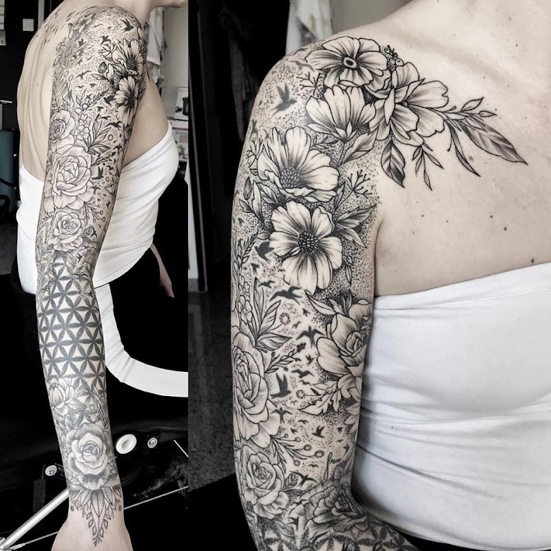 Blackwork sleeve met bloemen, vogels en geometrisch patroon.