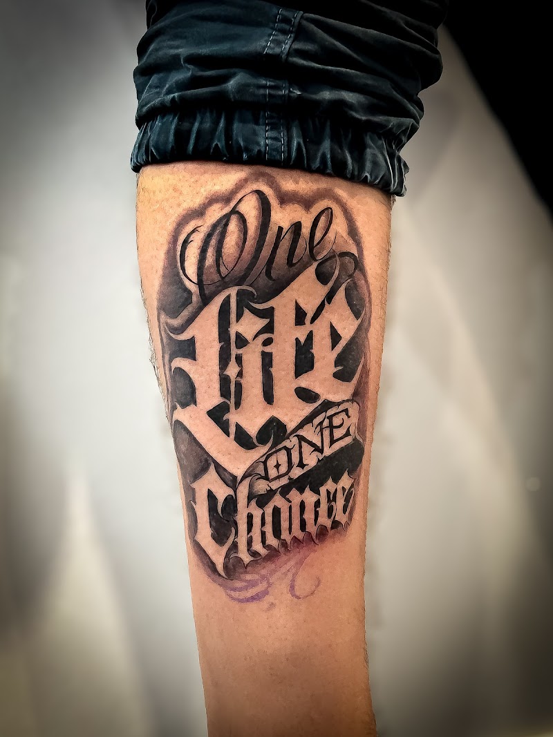 Zwart-wit lettering tattoo met de tekst "One Life One Chance" op het onderbeen.