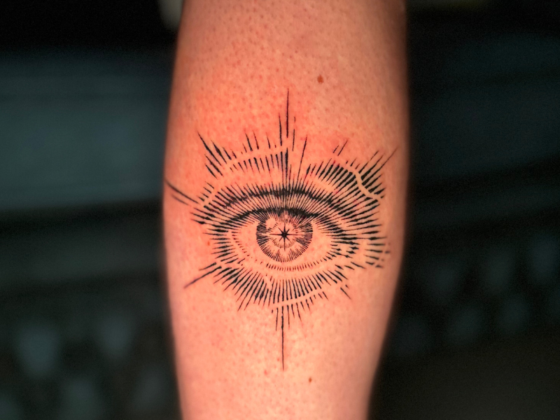 Blackwork tattoo van een oog met stralenkrans op de onderarm.