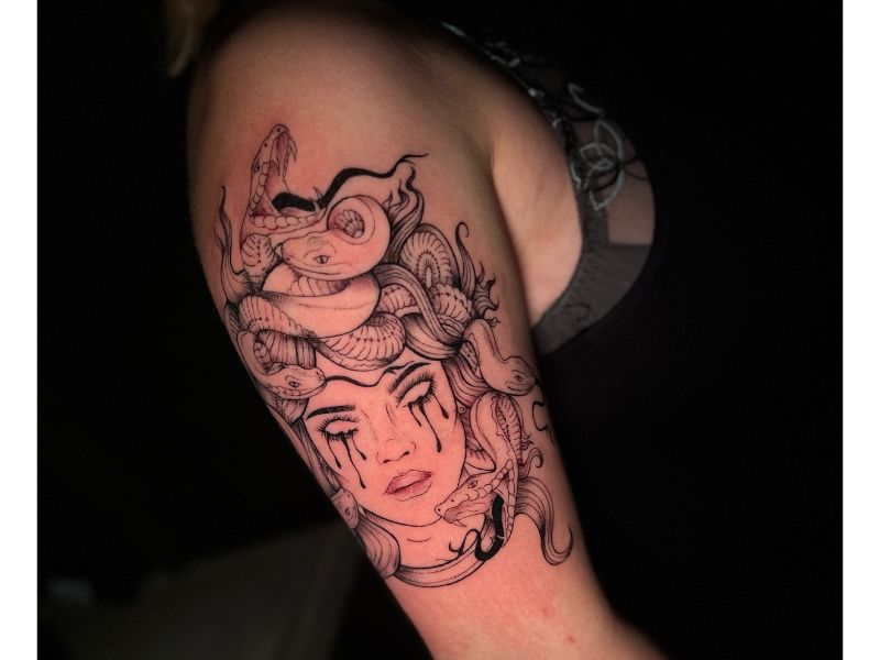 Blackwork Medusa tattoo met slangenhaar en tranen op bovenarm.