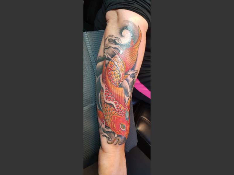 Japanse koi karper tattoo met golven op onderarm