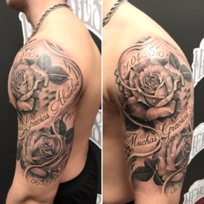 Realistische rozen met tekst "Muchas Gracias Abuelos" en datums op bovenarm.