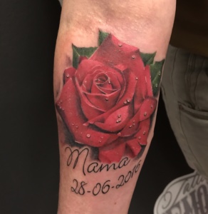 Realistische rode roos met waterdruppels en 'Mama 28-06-2016' tekst.
