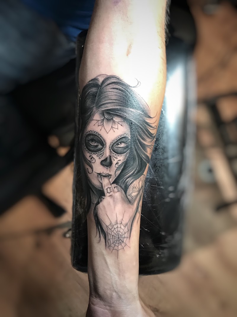 Zwart-wit tattoo van een vrouw met een suikerschedel gezicht en een vinger voor haar mond.