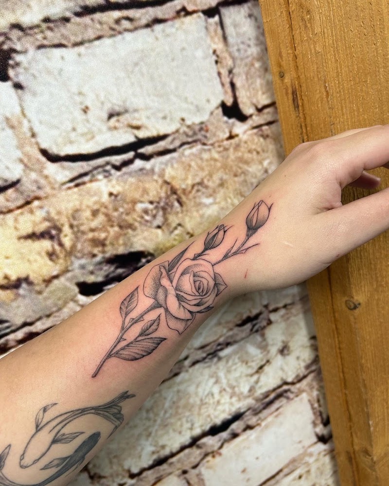 Fineline roos met knoppen en bladeren op de onderarm en pols.