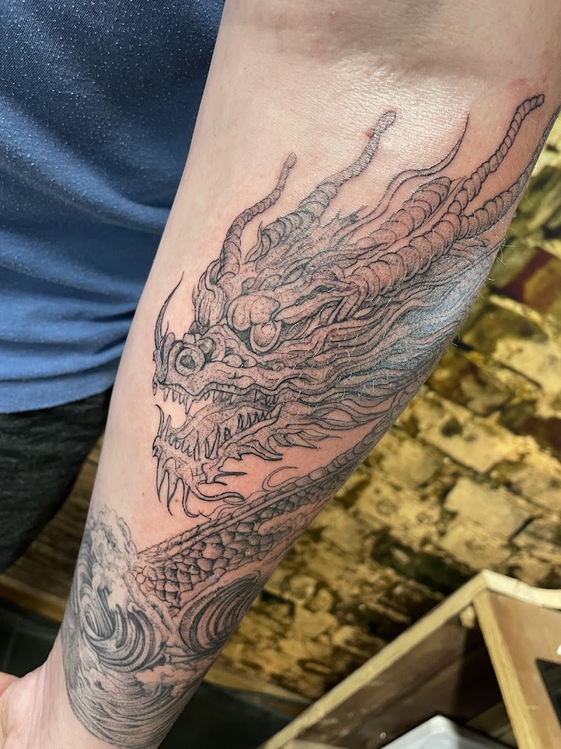 Zwart-grijze Japanse draak tattoo op onderarm.