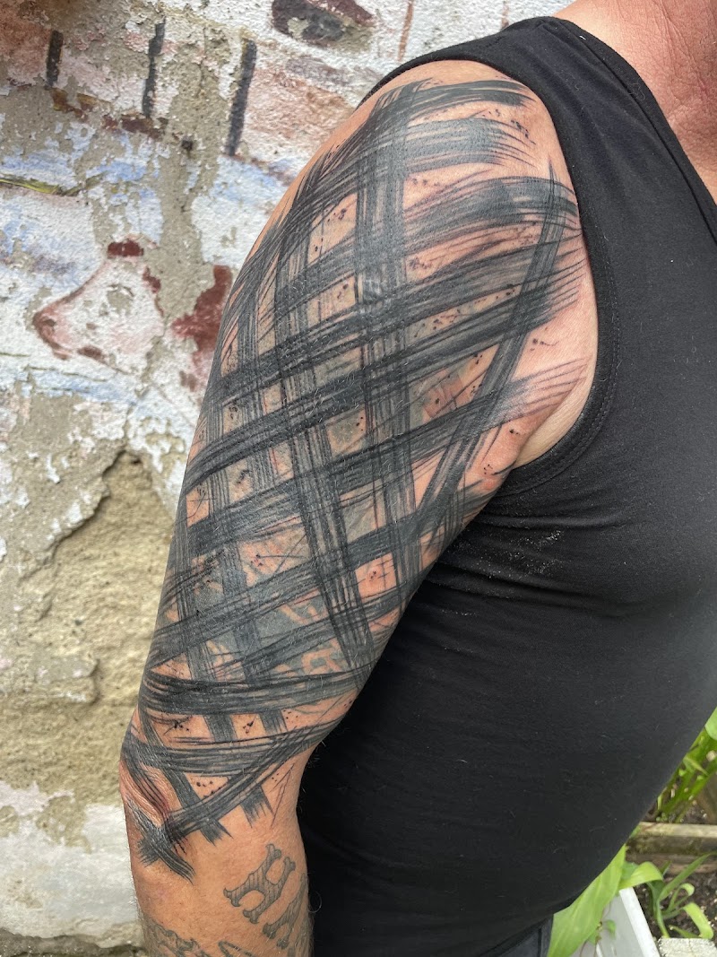 Abstracte zwarte penseelstreken op bovenarm.