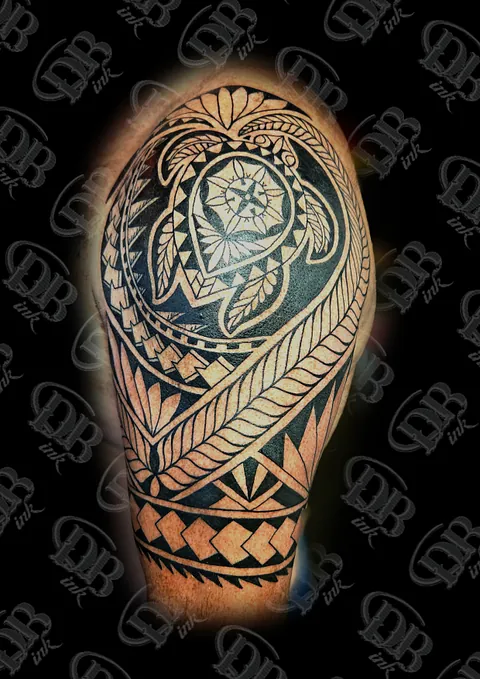 Grote Polynesische schildpad tattoo met tribal patronen op bovenarm.
