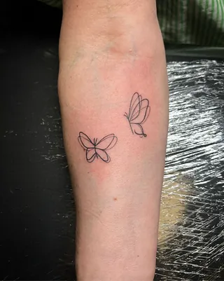 Twee minimalistische fineline vlinders op de onderarm.