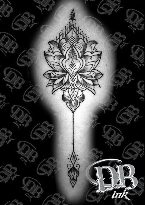 Zwartwerk ornamentale lotus tattoo met geometrische hanger.