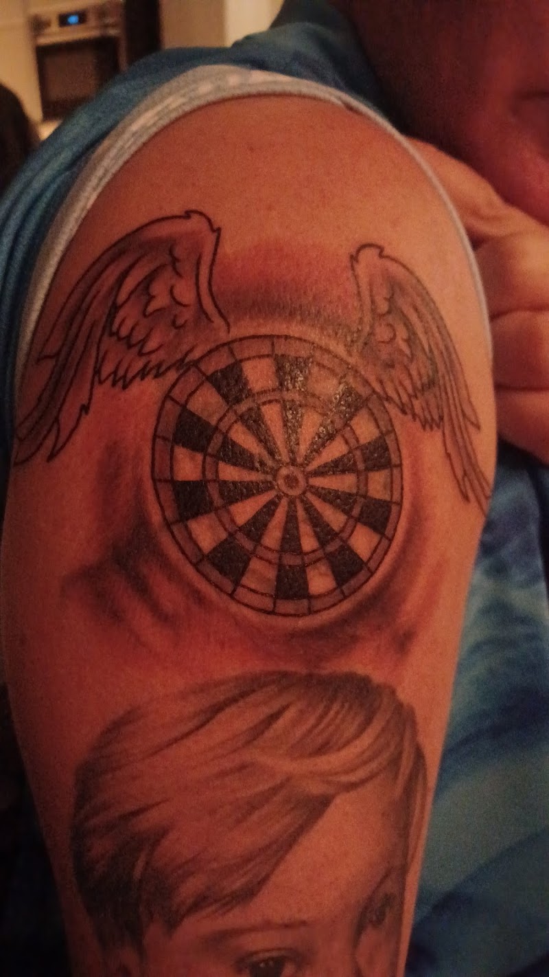 Zwart-wit tattoo van een dartbord met vleugels en een portret op de bovenarm.