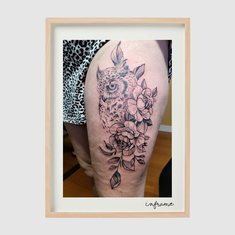 Zwart-wit tattoo van een uil met bloemen op het bovenbeen.