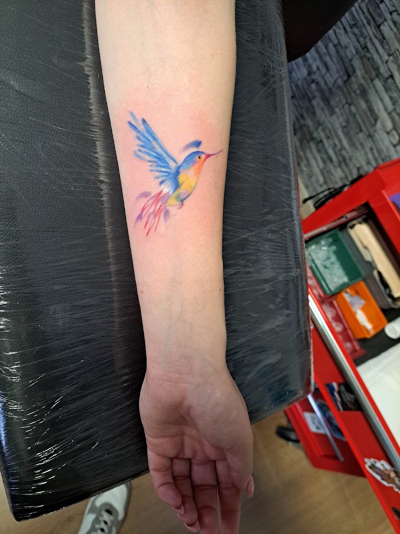 Kleurrijke aquarel kolibrie tattoo op de onderarm.