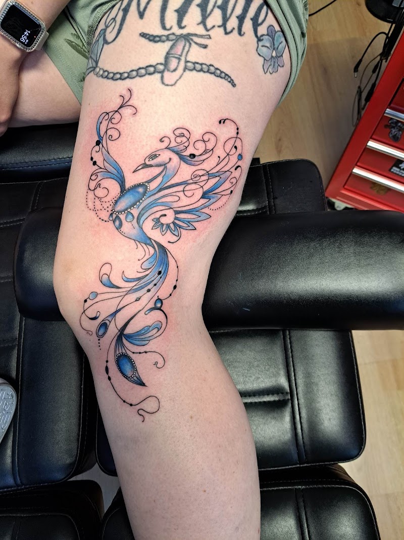 Sierlijke blauwe feniks tattoo met dotwork op bovenbeen.