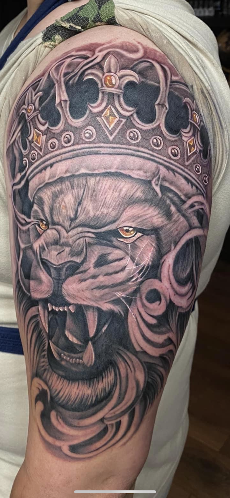 Realistische leeuw met kroon op bovenarm