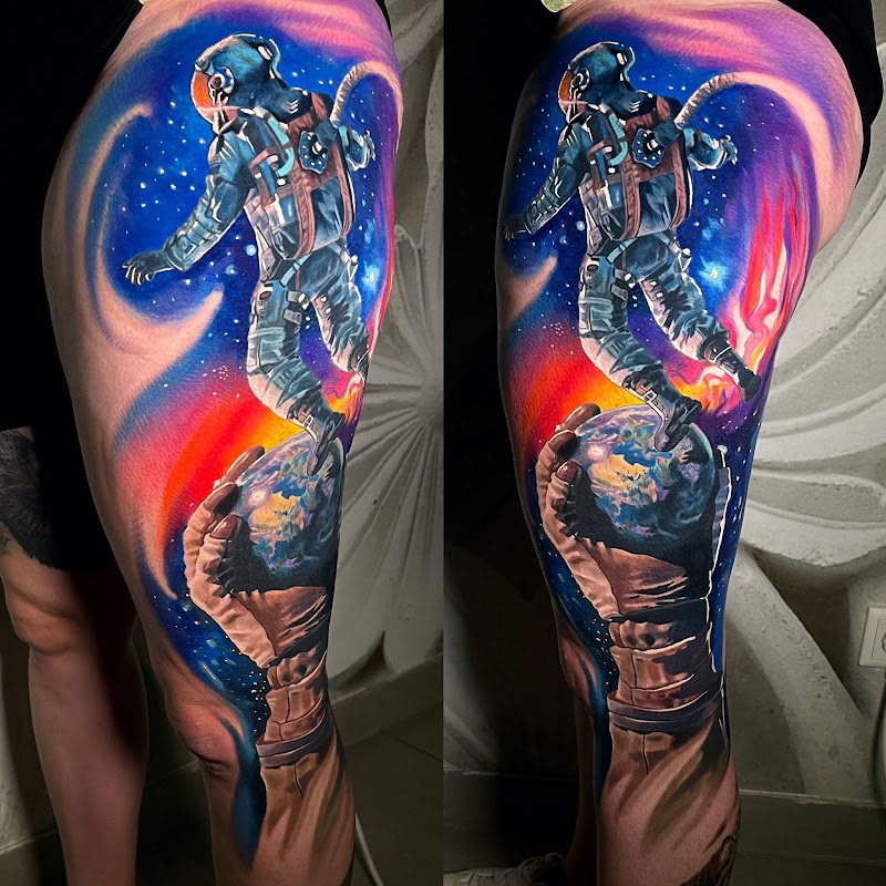 Kleurrijke astronaut en hand die de aarde vasthoudt op bovenbeen.
