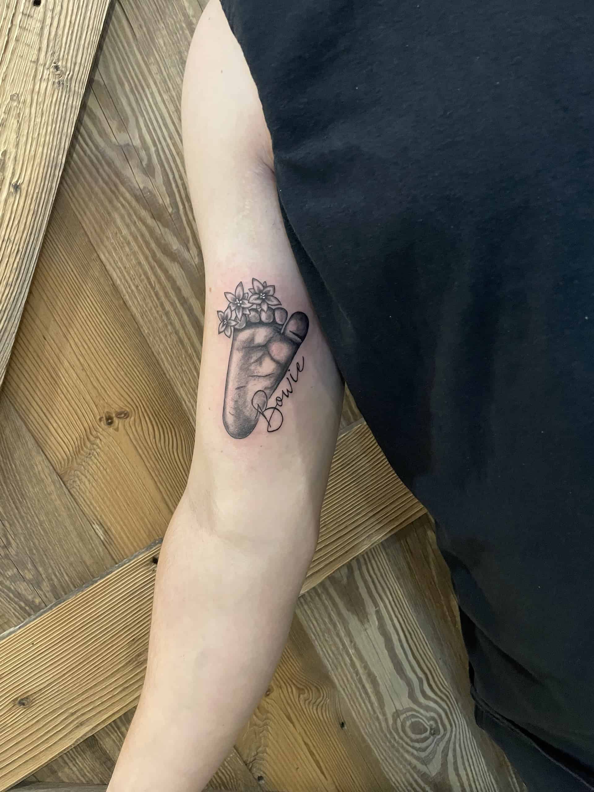 Realistische baby voetafdruk met bloemen en naam 'Bowie' op bovenarm.