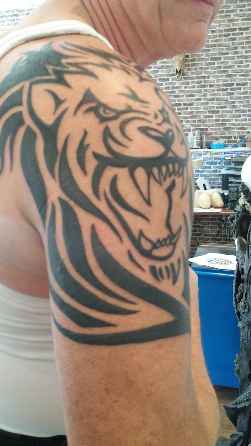 Tribal leeuwenkop tattoo op bovenarm.