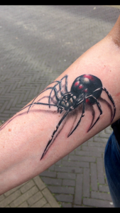 Realistische zwarte weduwe spin met 3D-effect op onderarm.