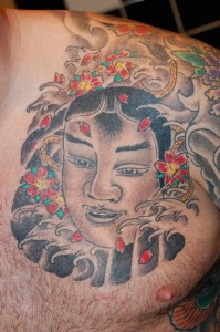 Japanse tattoo van een gezicht met kersenbloesems en golven op de borst.