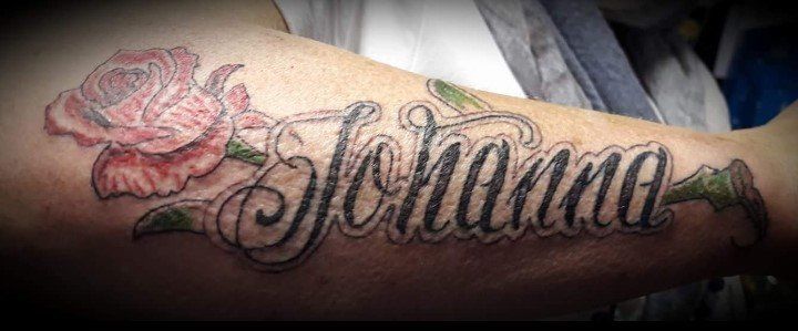 Rode roos met groene steel en de naam 'Johanna' in sierletters op de bovenarm.